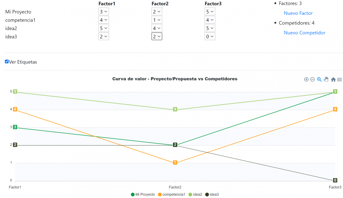 - En el eje vertical se refleja el nivel de valor de cada competidor, es decir, es el nivel de lo que se ofrece a los competidores en lo relacionado con todas las variables/factores clave de la competencia. Una puntuación elevada significa que se ofrece más a los clientes o proyecto y, por consiguiente, invierte más en la variable o factor en cuestión.