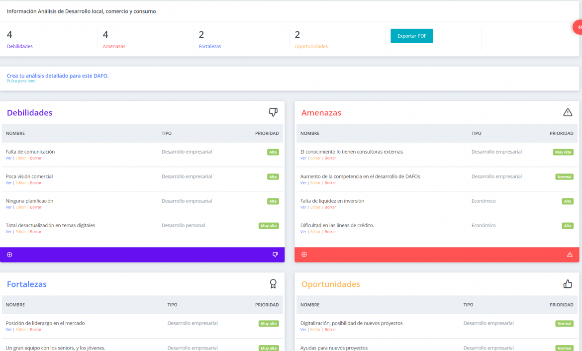 Puedes darte de alta y empezar a crear tu análisis DAFO, rápido , sencillo y gratis.